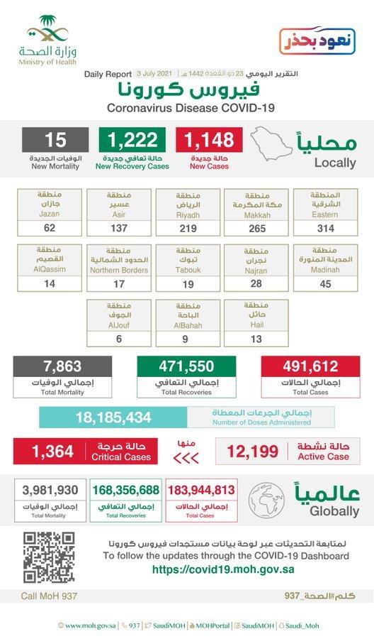 سجلت منها منطقة نجران 28 حالة.. “الصحة”: تسجيل 15 وفاة و1148 إصابة جديدة بفيروس “كورونا” وشفاء 1222 حالة