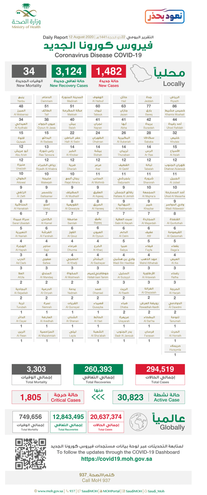 سجلت منها منطقة #نجران 37 حالة توزعت على مدينة نجران ومحافظات شرورة ويدمة وبدر الجنوب.. “الصحة”: تسجيل 1482 إصابة جديدة بفيروس “كورونا”