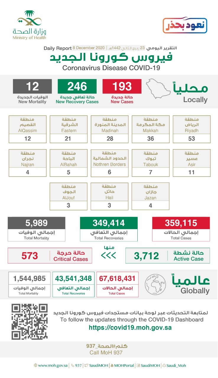 وأضافت الصحة أن إجمالي حالات المصابين في المملكة وصل إلى 359115 حالة حتى الآن ، ووصل مجموع المتعافين إلى 349414 حالة ، فيما بلغ إجمالي الوفيات 5989 حالة وفاة .