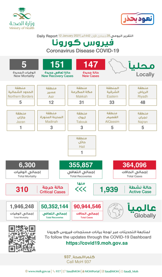 سجلت منها منطقة نجران 5 حالات جديدة.. الصحة: تسجيل 147 إصابات جديدة بفيروس كورونا و 151 حالة تعافٍ و 5 حالات وفاة