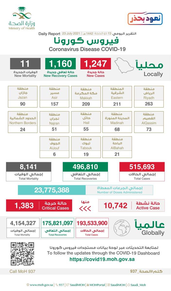 الصحة تعلن عن تسجيل (1247) حالة إصابة جديدة بفيروس كورونا (كوفيد-19)، وتسجيل (11) حالات وفيات رحمهم الله، وتسجيل (1160) حالة تعافي ليصبح إجمالي عدد الحالات المتعافية (496,810) حالة ولله الحمد.