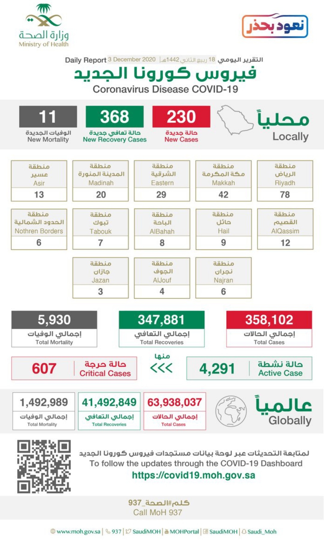 سجلت منها منطقة نجران 6 حالات.. الصحة تعلن تسجيل 230 إصابة جديدة بفيروس كورونا، و 368 حالة تعافي خلال ال 24 ساعة الماضية، و5930 إجمالي الوفيات.