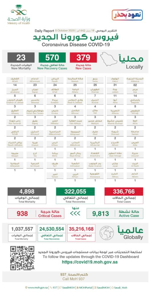 وجاء توزيع حالات الإصابة الجديدة بين مناطق ومدن المملكة كالتالي :