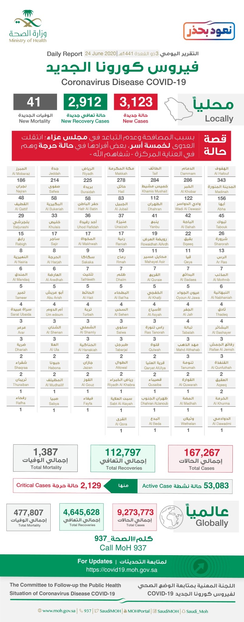 سجلت 48 حالة في مدينة ⁧‫نجران‬⁩ و 13 حالة بمحافظة ⁧‫شرورة‬⁩ وحالتين في محافظة ⁧‫حبونا‬⁩… “الصحة”: تسجيل 3123 إصابة جديدة بفيروس “كورونا” .. و41 حالة وفاة