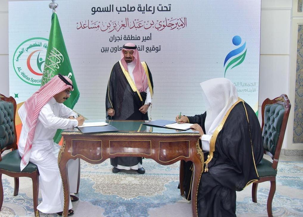 جاء ذلك خلال رعاية سموه في الإمارة اليوم، توقيع جمعية رعاية الأيتام بالمنطقة عدداً من الشراكات المجتمعية مع كل من مجمع الوفاء التخصصي الطبي بالمنطقة الذي مثله مدير المجمع هادي بنيان آل عامر، ونادي الأخدود الرياضي ومثله عضو مجلس الإدارة تركي آل فاضل , فيما مثل الجمعية رئيس مجلس إدارتها الدكتور يوسف الحازمي.
