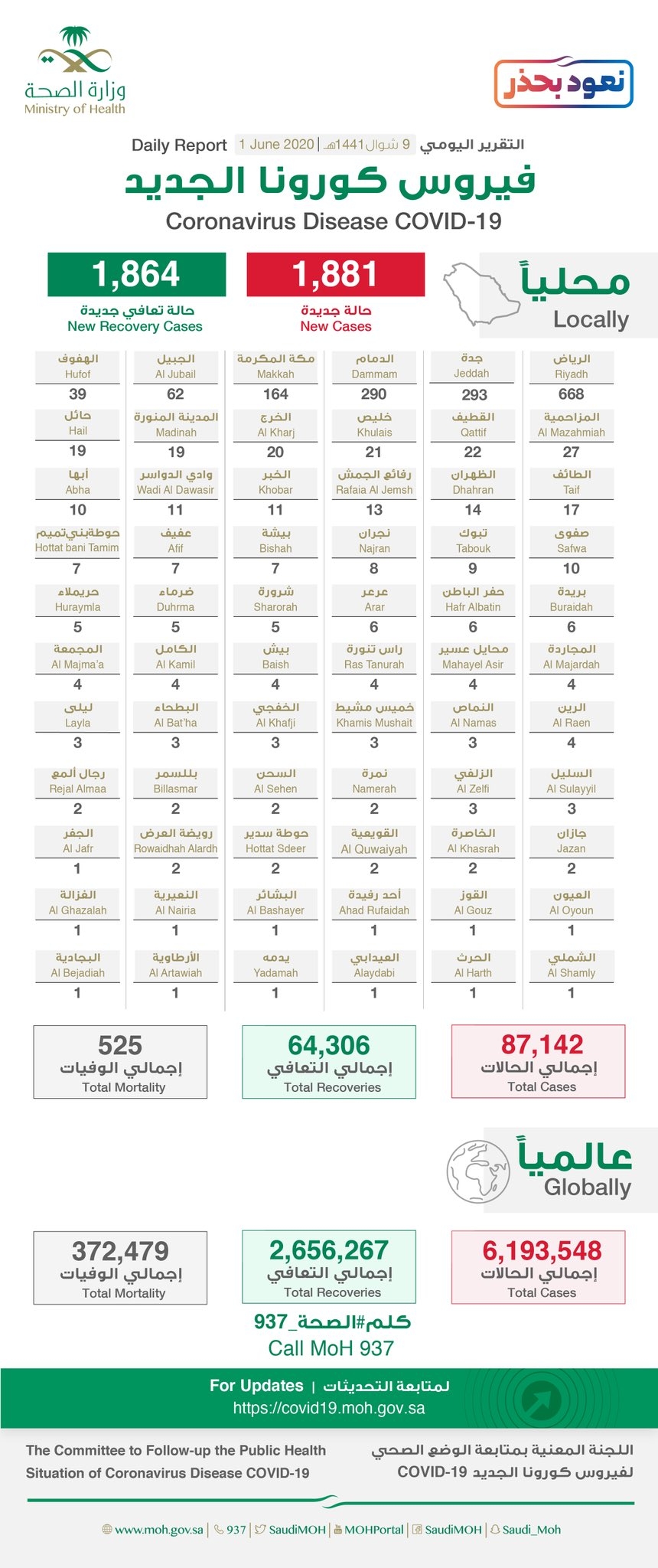 وأضافت الوزارة في البيان الصحفي اليومي حول مستجدات فيروس كورونا بالمملكة: أن إجمالي الإصابات بكورونا ارتفع إلى 87142 حالة.