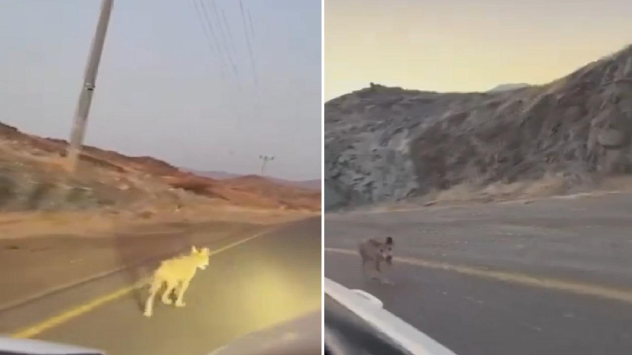 ذيب يتهجم على مركبة أثناء سيرها على طريق القاحة غرب #المدينه_المنورة pic.twitter.com/zF5QMcSFVH