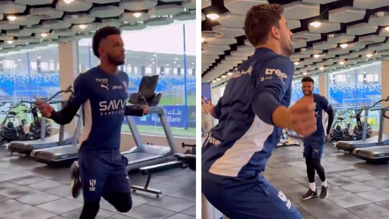 وظهر البليهي في مقطع فيديو وهو يؤدي تمرين القفز بالحبل بتركيز كبير داخل الصالة الرياضية، قبل أن يقلده نيفيز بأسلوب ساخر، مما أثار ضحك اللاعبين والحاضرين.