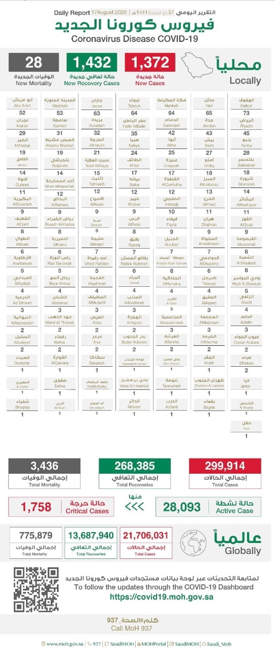 سجلت منها منطقة نجران 45 حالة جديدة توزعت على مدينة نجران ومحافظات شرورة وبدر الجنوب.. الصحة تعلن تسجيل 1372 إصابة جديدة بفيروس كورونا