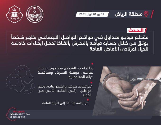 صَرّح المتحدث الإعلامي لشرطة منطقة الرياض الرائد خالد الكريديس، بأنه إشارة إلى مقطع فيديو متداول في مواقع التواصل الاجتماعي يوثق فيه أحد الأشخاص من خلال حسابه قيامه بالتحرش بألفاظ تحمل إيحاءات خادشة للحياء لمرتادي الأماكن العامة، مما يمثل جريمة وفق نظامي جريمة التحرش ومكافحة جرائم المعلوماتية، فقد تمكنت الجهات الأمنية – بفضلٍ من الله – من تحديد هويته والقبض عليه، وهو مواطن في العقد الثاني من العمر، وجرى إيقافه واتخذت بحقه جميع الإجراءات الأولية النظامية وإحالته إلى النيابة العامة.