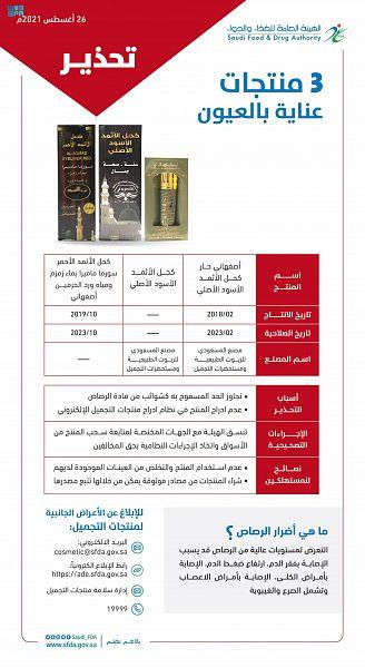 حذّرت الهيئة العامة للغذاء والدواء من ثلاثة منتجات كحل عيون، لاحتوائها على نسبة عالية من الرصاص، تجاوزت الحد المسموح به كشوائب.