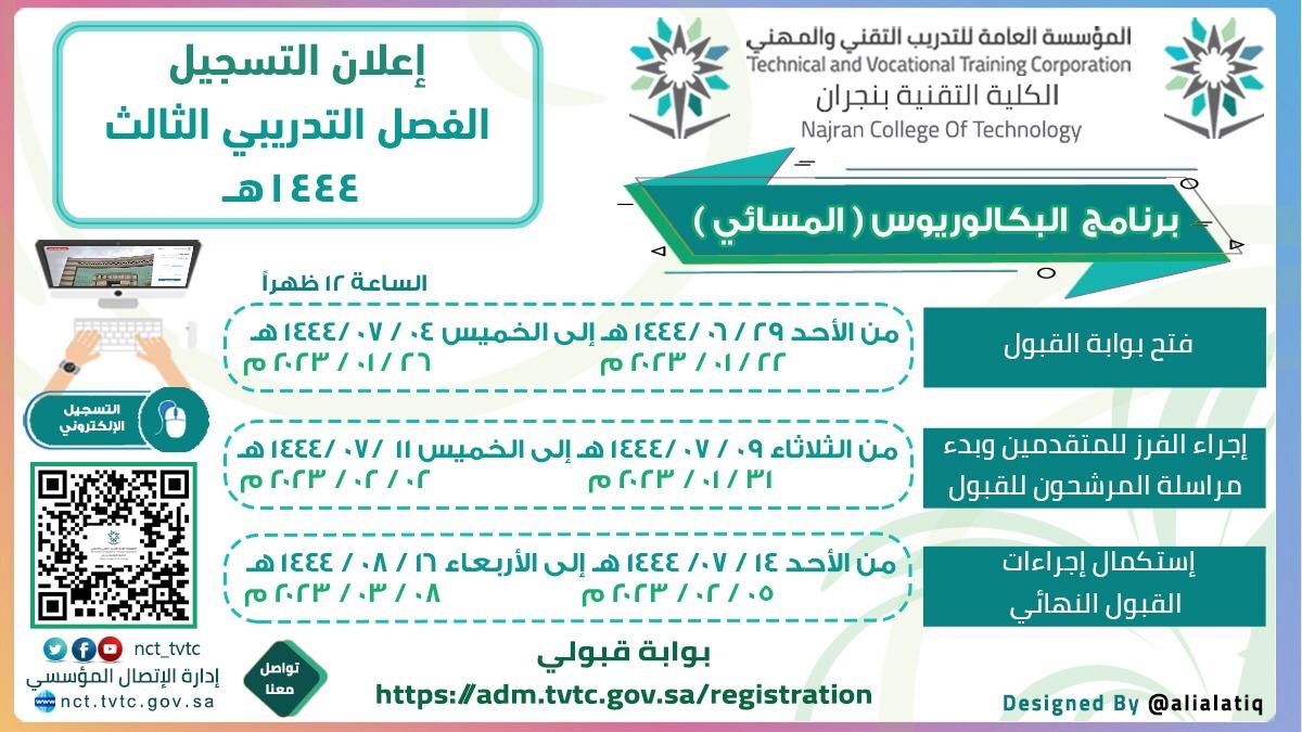 أعلنت الكلية التقنية بنجران عن موعد استقبال طلبات القبول في برنامج البكالوريوس المسائي للفصل التدريبي الثالث من العام التدريبي 1444 هـ اعتباراً من يوم الأحد القادم ولمدة خمسة أيام وذلك عبر موقع قبولي https://adm.tvtc.gov.sa/registration.