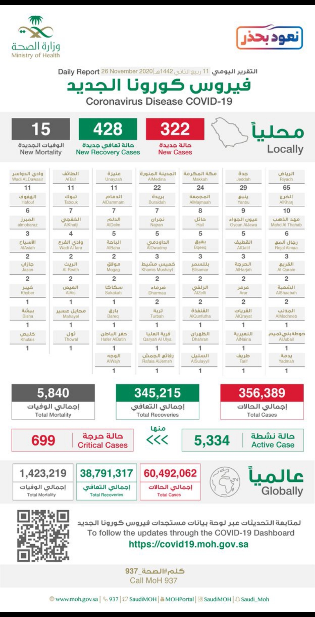 سجلت منها منطقة نجران 6 حالات جديدة توزعت على مدينة نجران ومحافظة يدمة.. الصحة تعلن تسجيل 322 إصابة جديدة بفيروس كورونا