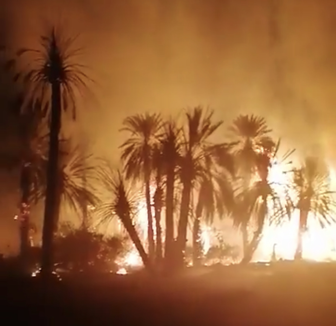 وأظهر مقطع فيديو كثافة النيران المشتعله في عدد كبير من النخيل.
