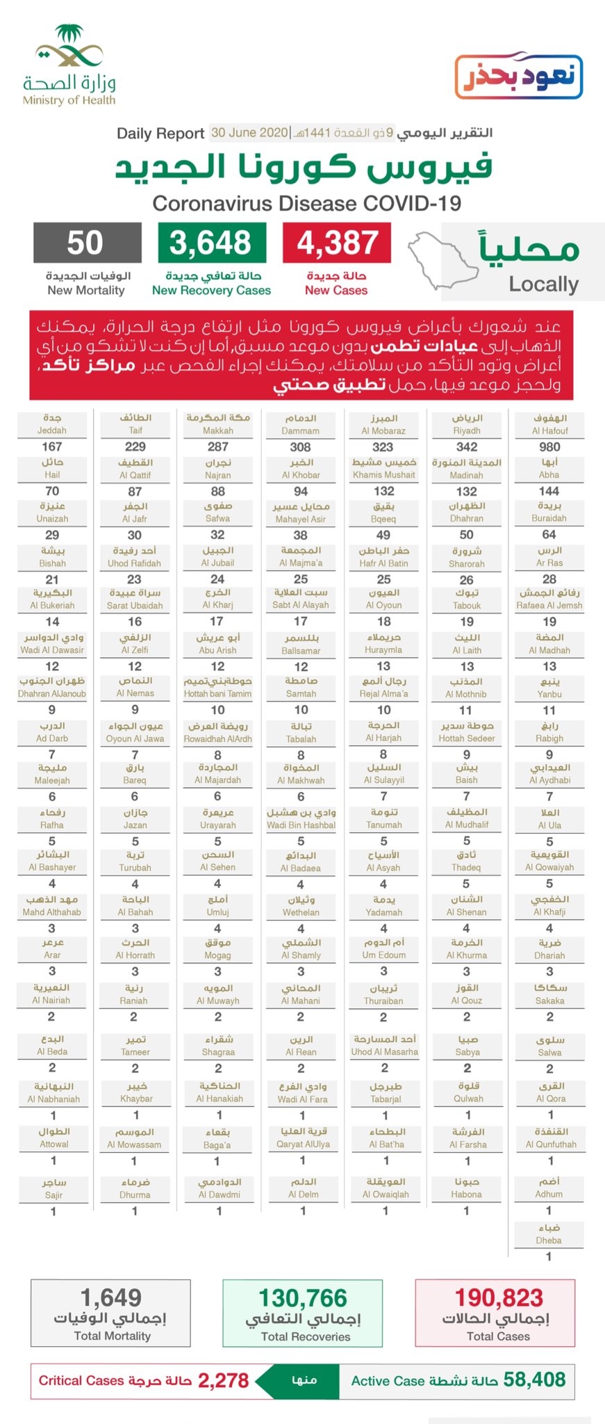 سجلت مدينة نجران 88 حاله جديدة وسجلت كلاً من محافظة #شرورة 26 حالة فيما سجلت محافظة #يدمة 4 حالات وحاله واحده في #حبونا ..