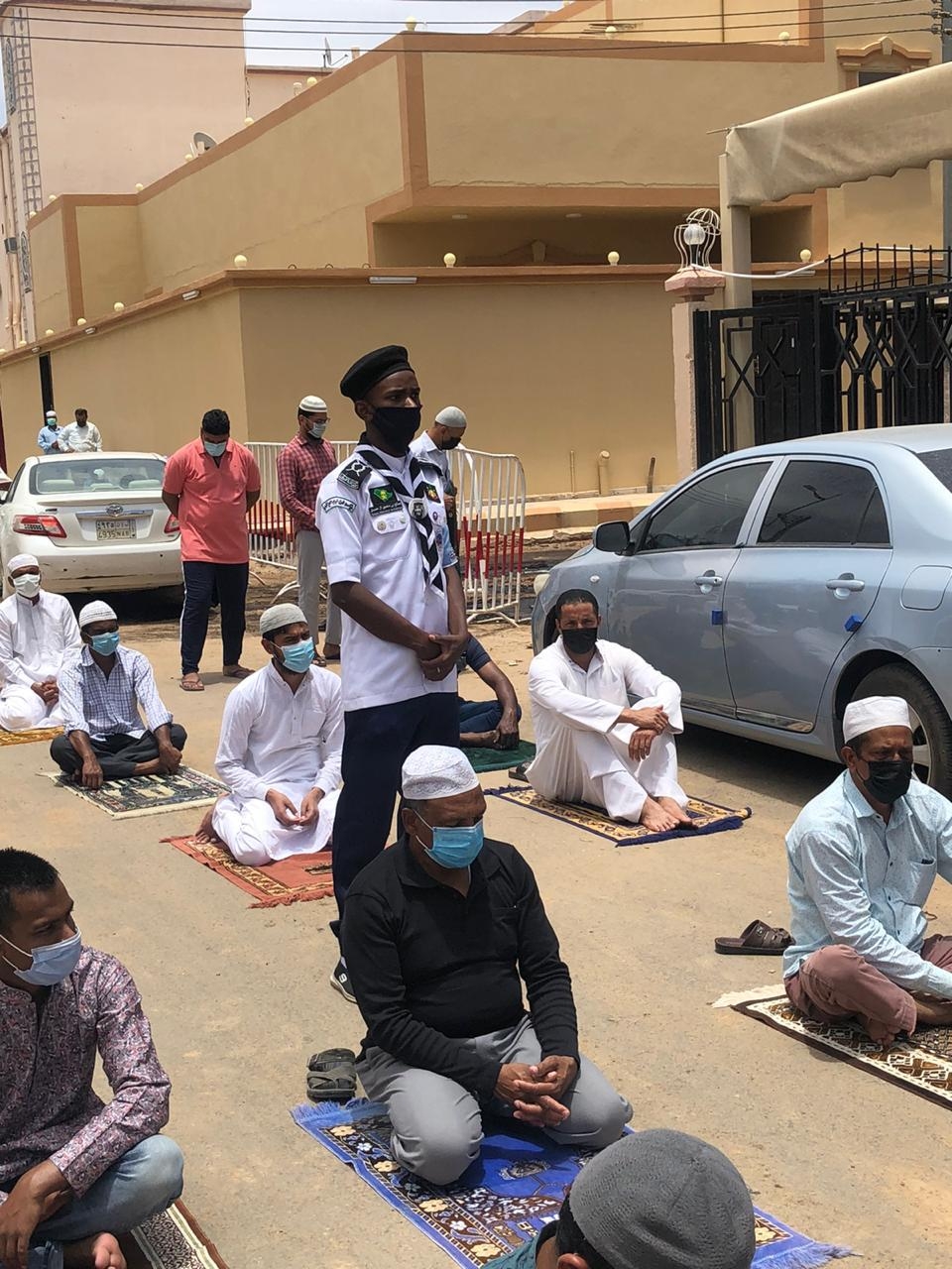 وذلك بعمل مسافة كافية بينهم ونظم الكشافة عملية الدخول والخروج من المسجد بترك مسافة كافية بين المصلين أثناء الدخول والخروج