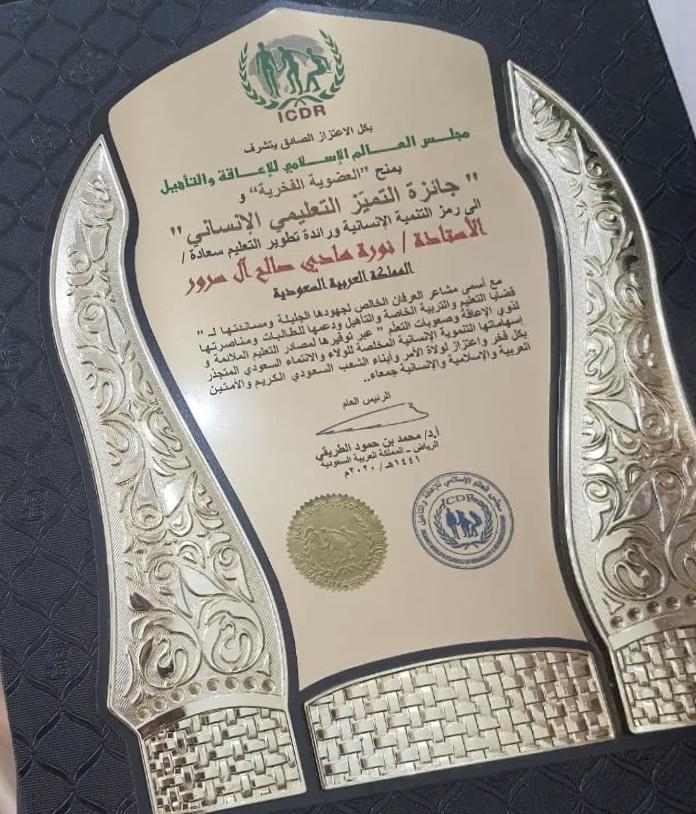 منح مجلس العالم الإسلامي للإعاقة والتأهيل ICDR العضوية الفخرية ؛ وجائزة التميز للعمل الإنساني للأستاذة / نورة آل سرور من الإدارة العامة للتعليم بمنطقة نجران وعضو المجلس الاستشاري للمعلمين بوزارة التعليم .