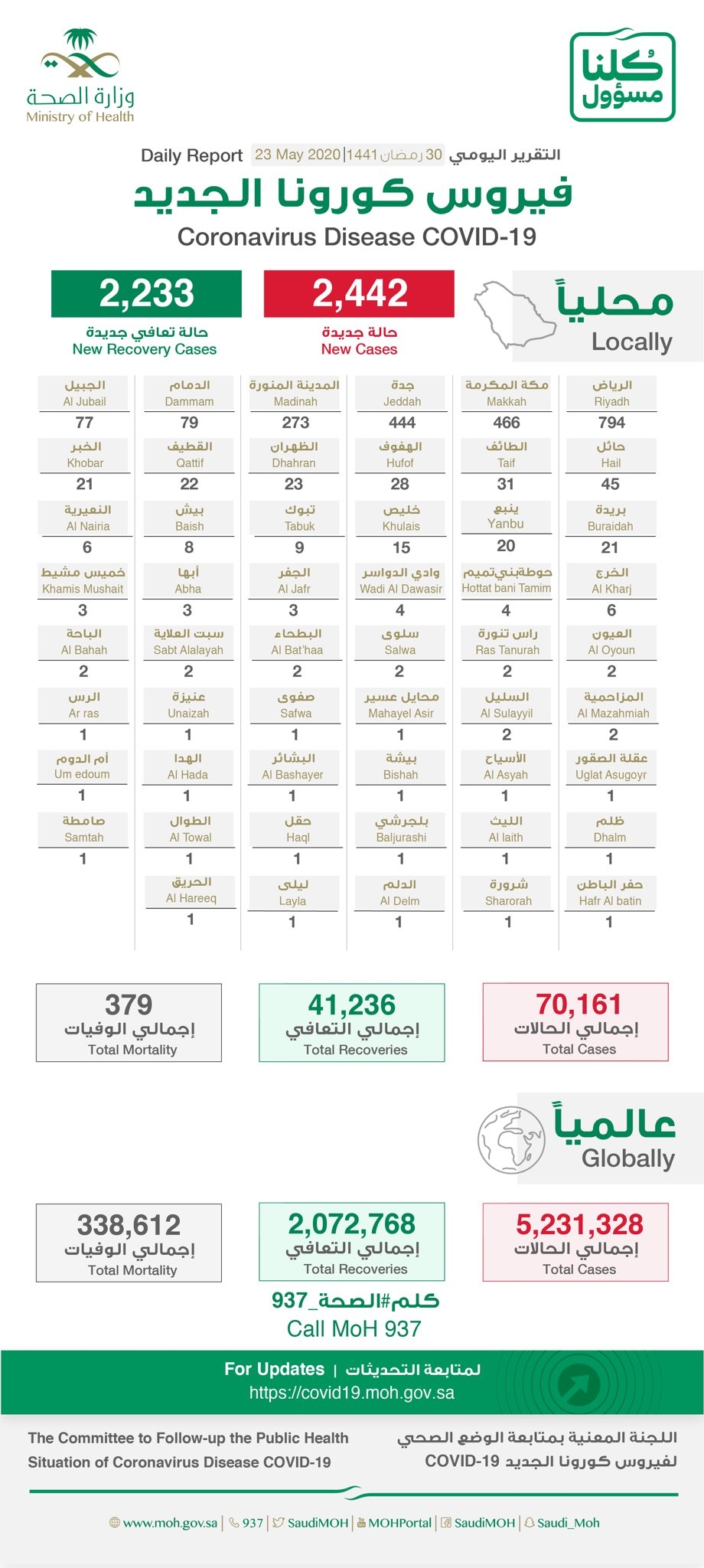 منها حالة جديده سجلت في شرورة.. الصحة: تسجيل (2442) حالة مؤكدة جديدة مصابة بفيروس كورونا.. تعرف على توزيع الحالات حسب مدن المملكة