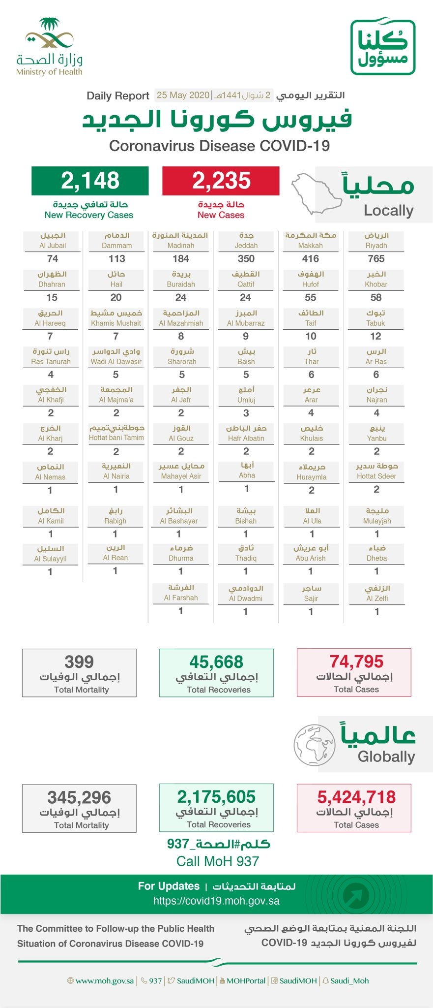 منها (4) حالات جديده سجلت في نجران.. الصحة: تسجيل (2235) حالة مؤكدة جديدة مصابة بفيروس كورونا.. تعرف على توزيع الحالات حسب مدن المملكة