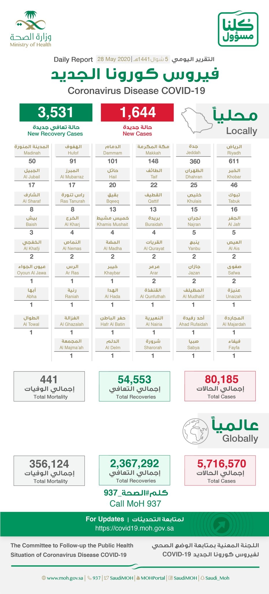 منها (5) حالات جديده سجلت في نجران.. الصحة: تسجيل (1644) حالة مؤكدة جديدة مصابة بفيروس كورونا.. تعرف على توزيع الحالات حسب مدن المملكة