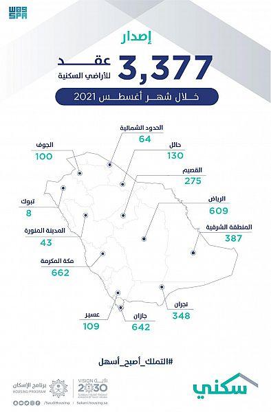 وأوضح “سكني” في بيان صحافي، أن الأراضي شملت 609 أراضٍ في منطقة الرياض، و662 أرضاً في منطقة مكة المكرمة، وفي المنطقة الشرقية 387 أرضاً، إضافة إلى 642 أرضاً في منطقة جازان، و348 أرضاً في منطقة نجران، و275 في منطقة القصيم، و130 أرضاً ضمن منطقة حائل، وفي منطقة عسير 109 أراضٍ، و100 أرضٍ لمستفيدي “سكني” في منطقة الجوف، و64 في منطقة الحدود الشمالية، و43 في منطقة المدينة المنورة، و8 أراضٍ سكنية في منطقة تبوك.
