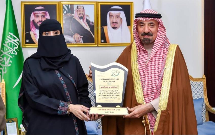 أمير نجران يكرم المعلمة أميرة اليامي بعد حصولها على جائزة الشيخ حمدان بن راشد للأداء التعليمي المتميّز