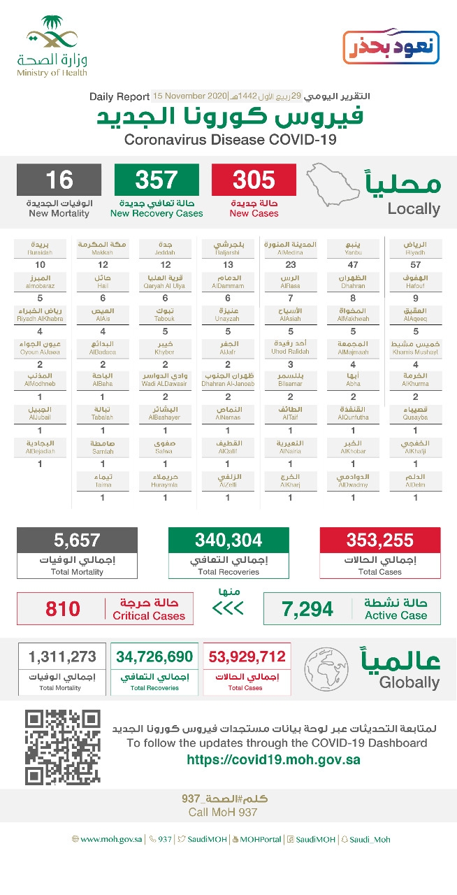 أعلنت وزارة الصحة، اليوم الأحد ، عن تسجيل 305 إصابة جديدة بفيروس “كورونا”، و 16 حالة وفاة ، و 357 حالة تعافي .