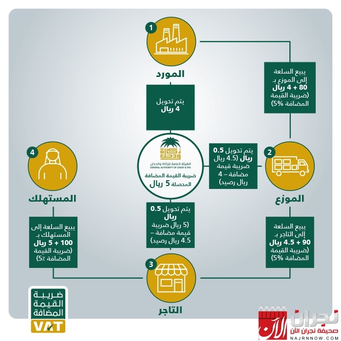 وأوضحت هيئة الزكاة والدخل أن المملكة التزمت بتطبيق ضريبة القيمة المضافة بنسبة 5% بدءاً من 1 يناير 2018 (14 ربيع الثاني ١٤٣٩ .