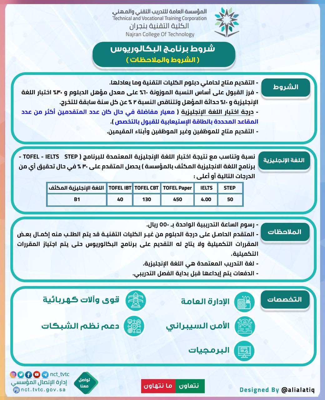 التخصصات والشروط والملاحظات لبرنامج البكالوريوس المسائي بالكلية التقنية بنجران