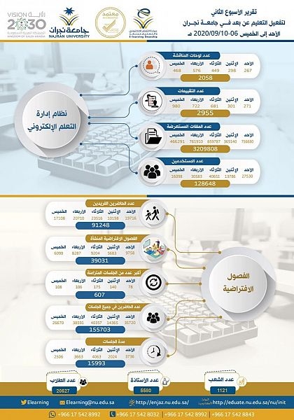 يواصل طلاب جامعة نجران الدراسة عن بُعد للأسبوع الثالث على التوالي، وسط منظومة من الخدمات التقنية المتكاملة، إذ بلغ عدد المستخدمين لنظام التعليم عن بعد الأسبوع الماضي في الفترة من 18 إلى 22 محرم الجاري نحو 129 ألف مستخدم.