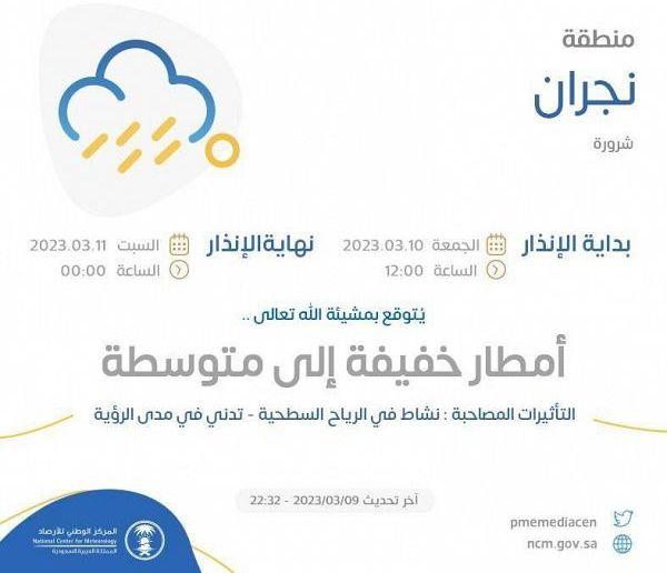 نبّه المركز الوطني للأرصاد اليوم، من هطول أمطار خفيفة إلى متوسطة، ونشاط في الرياح السطحية على محافظة شرورة ، تؤدي إلى تدنِ في مدى الرؤية على المحافظة.