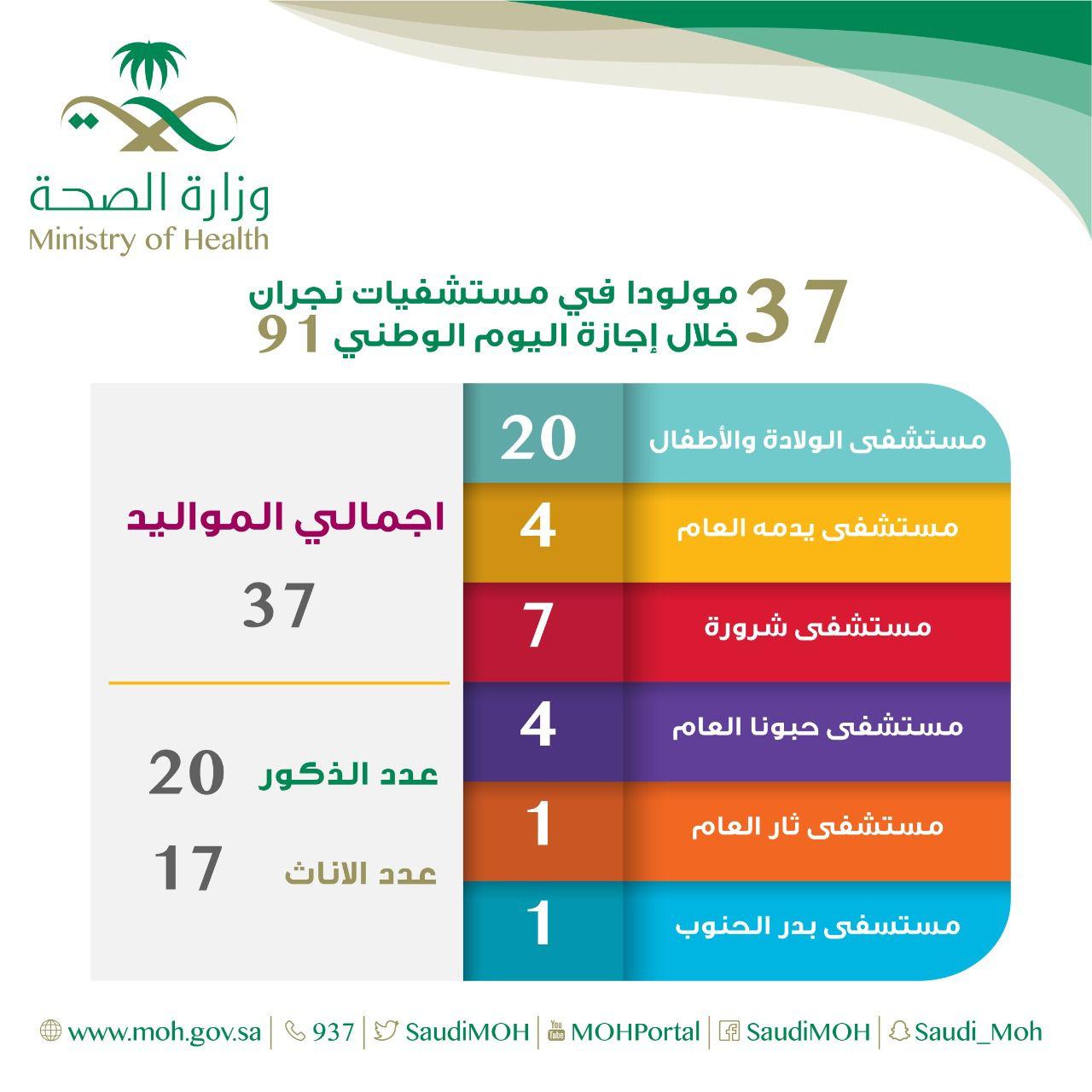 وقالت الصحة في نجران ان عدد المواليد بمستشفى الولادة والأطفال بلغ 20 مولوداً و مستشفى شروره العام 7 مواليد ، ومستشفى يدمة 4 مواليد ، فيما بلغ عدد المواليد في مستشفى حبونا العام 4 مواليد ، و مستشفى ثار العام مولود ، و مستشفى بدر الجنوب مولود .