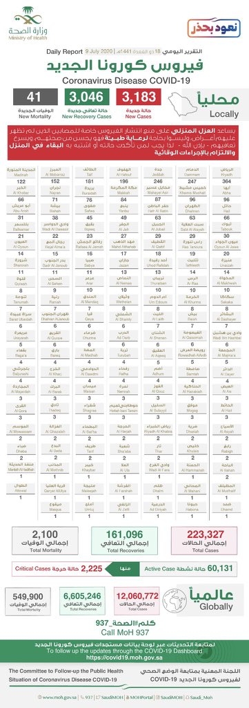 كشفت وزارة الصحة، اليوم الخميس، عن تسجيل 3183 إصابة جديدة بفيروس كورونا المستجد «كوفيد- 19» في المملكة؛ ما يرفع إجمالي الإصابات إلى 223327، في حين بلغ إجمالي حالات التعافي 161096.