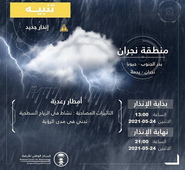 المركز الوطني للأرصاد يصدر تنبيهاً بهطول أمطار رعدية على منطقة نجران هذا اليوم