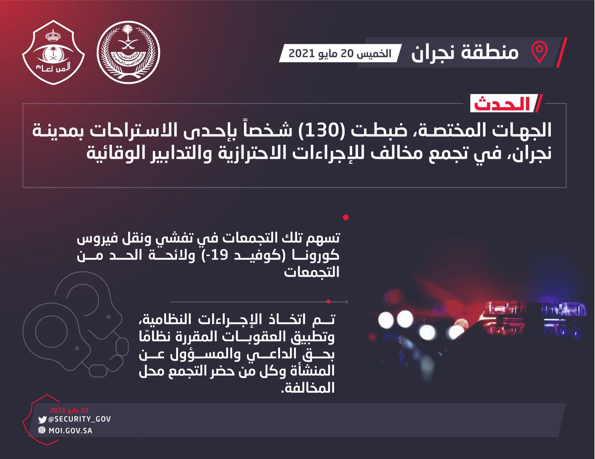 اعلنت شرطة منطقة نجران عن ضبط (130) شخصاً في تجمع مخالف للإجراءات الاحترازية بأحد الإستراحات وتم اتخاذ الاجراءات النظاميه بحقهم…
