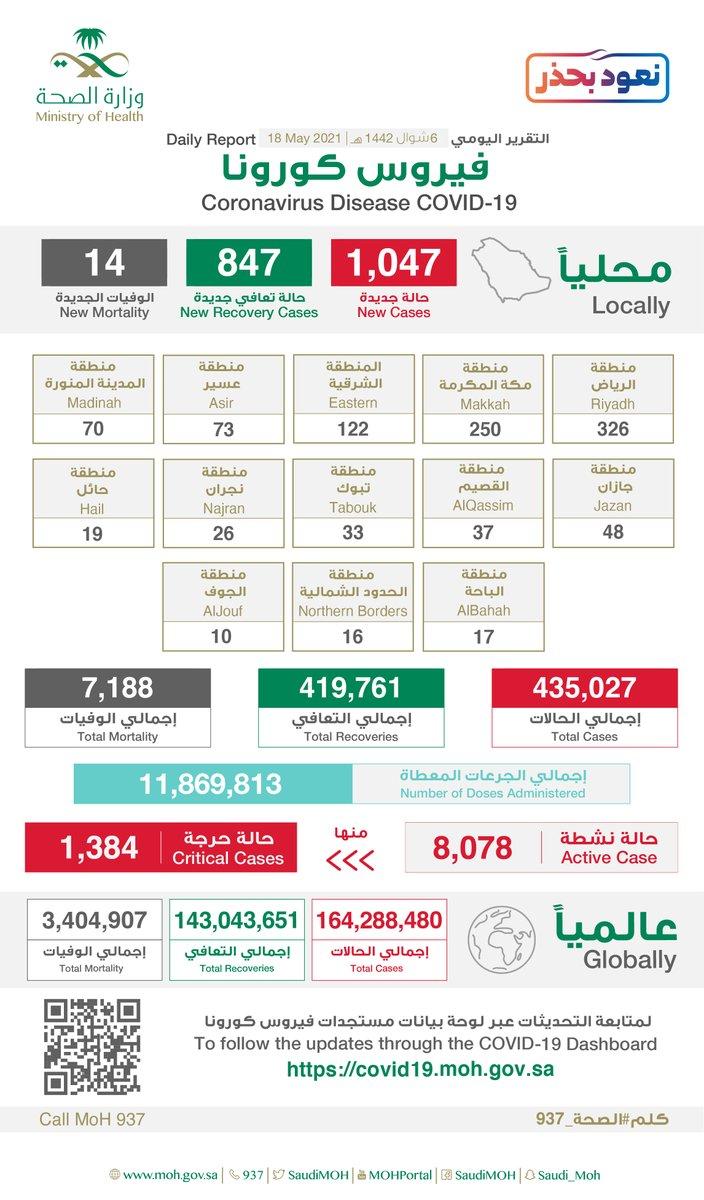 #الصحة تعلن عن تسجيل (1047) حالة إصابة جديدة بفيروس كورونا (كوفيد-19)، وتسجيل (14) حالات وفيات رحمهم الله، وتسجيل (847) حالة…