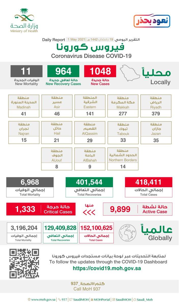 سجلت منها منطقة نجران 15 حالة.. الصحة تعلن عن تسجيل (1048) حالة إصابة جديدة بفيروس كورونا