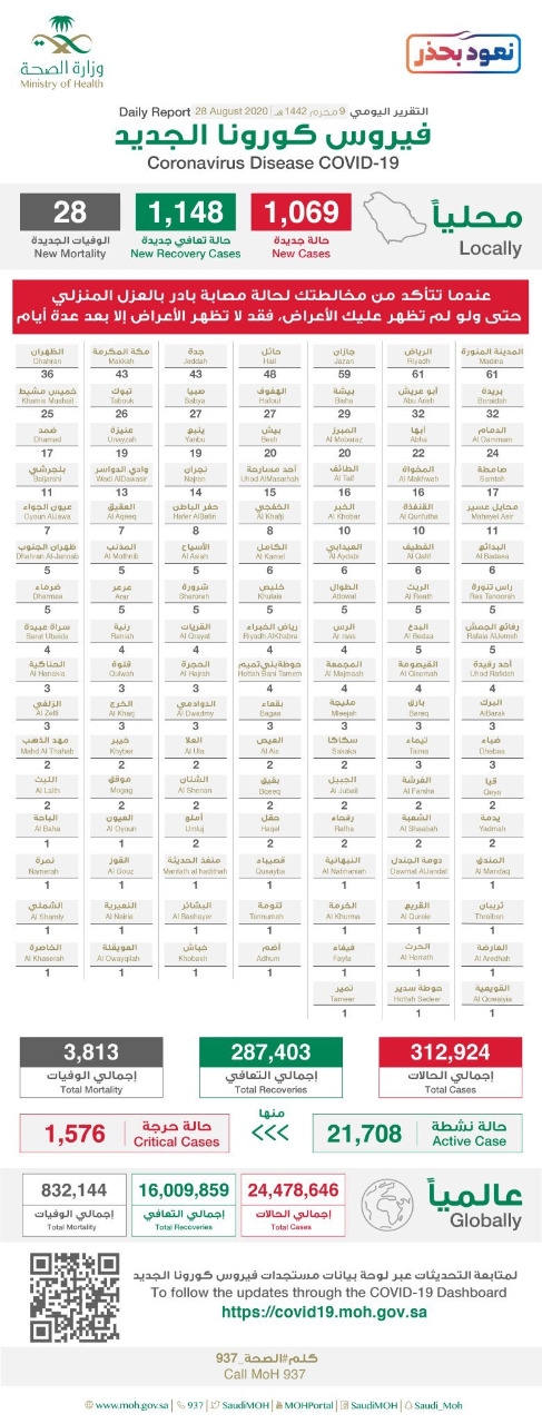 سجلت منطقة نجران 24 حاله، منها 7 حالة في محافظة شرورة وسجلت محافظة يدمة 6 حالات… وزارة الصحة تعلن تسجيل 987 حالة إصابة جديدة بفيروس كورونا