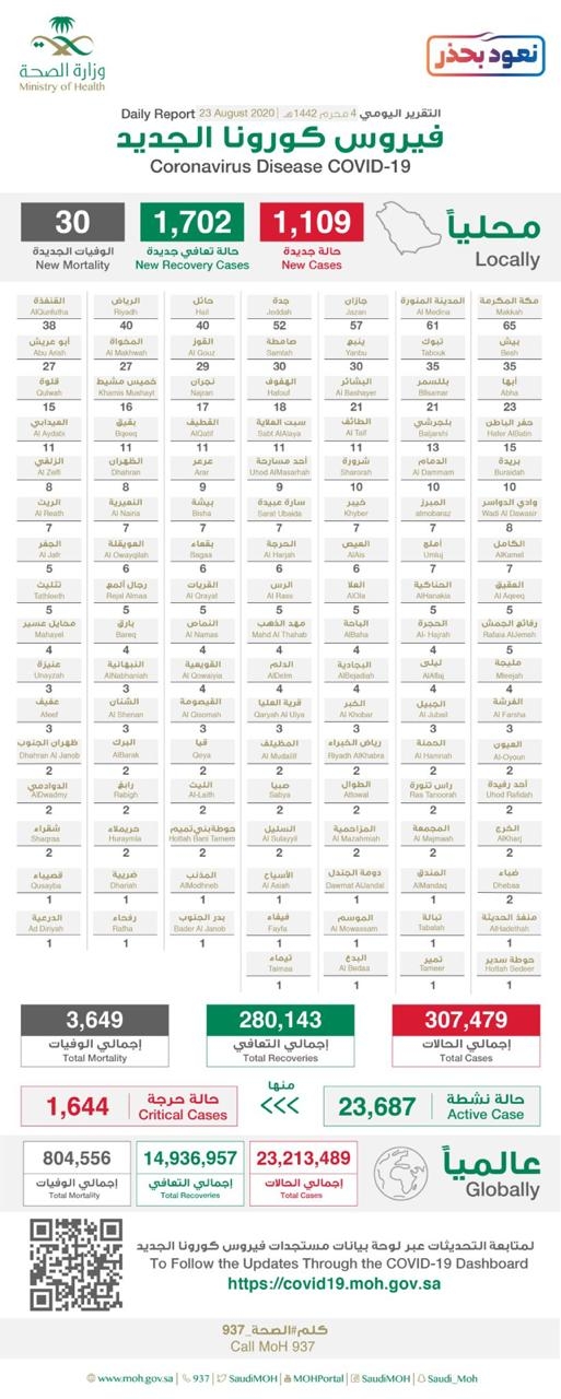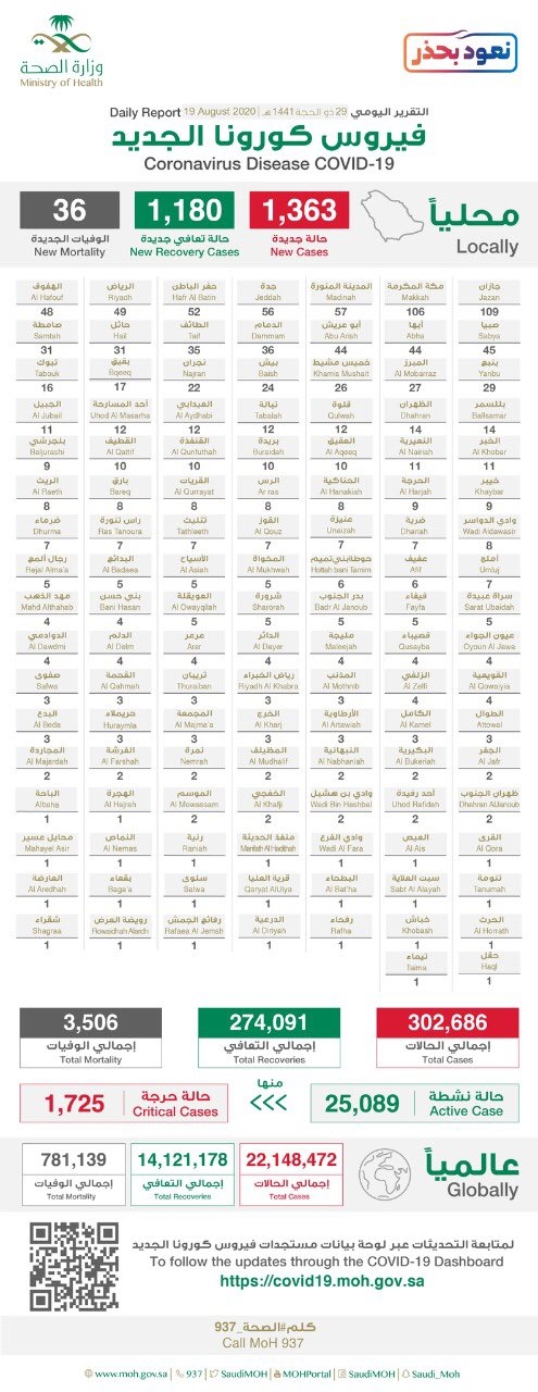 سجلت منها منطقة نجران 33 حالة جديدة توزعت على مدينة نجران ومحافظات شرورة وبدر الجنوب وخباش وحبونا.. #عاجل.. “#الصحة” تعلن تسجيل 1363 إصابة جديدة ب”كورونا”