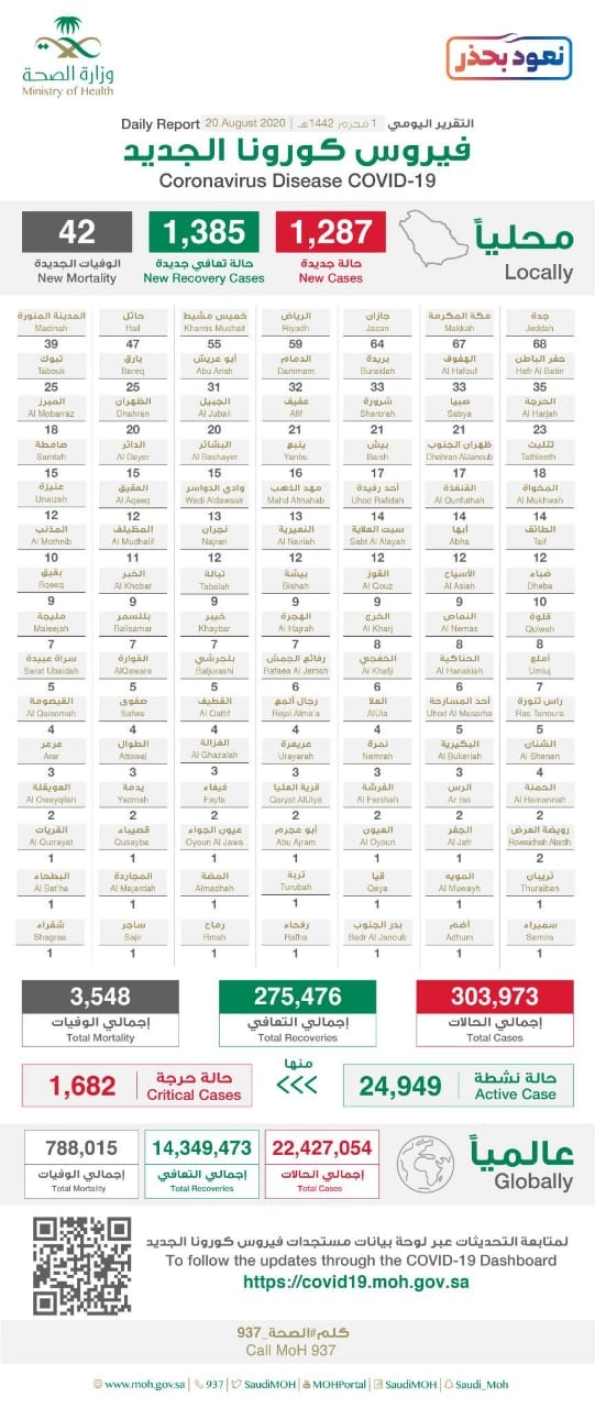 سجلت منها منطقة نجران 36 حالة جديدة توزعت على مدينة نجران ومحافظات شرورة وبدر الجنوب ويدمة.. «الصحة» تسجل 1287 إصابة جديدة بفيروس كورونا