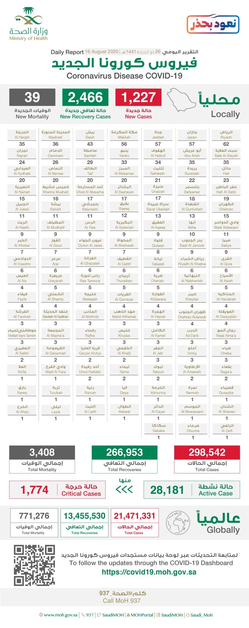 سجلت منها منطقة #نجران 33 حالة توزعت على مدينة نجران ومحافظة بدر الجنوب.. “الصحة” تعلن تسجيل 2466 حالة تعاف جديدة من “كورونا” و 1227 إصابة