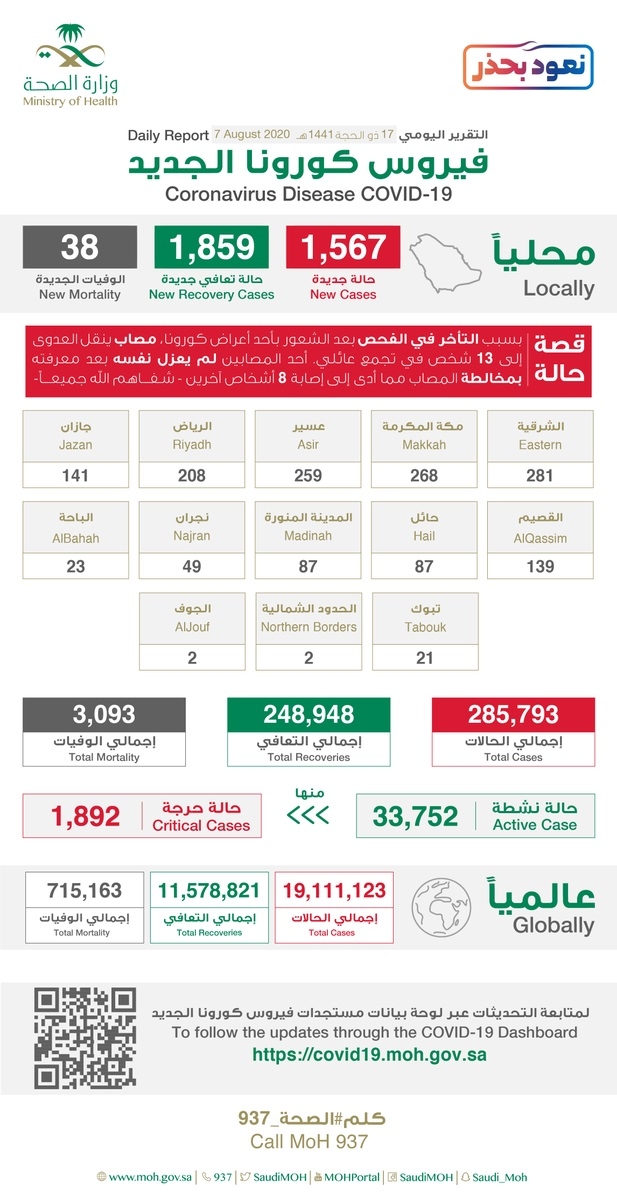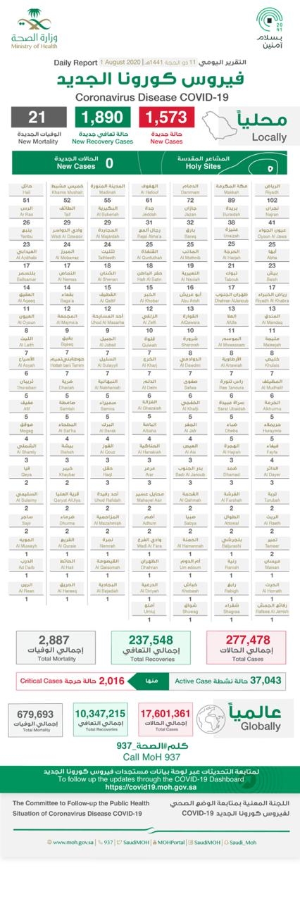 سجلت منها منطقة نجران 53 حالة توزعت على مدينة نجران ومحافظات شرورة و بدر الجنوب وخباش.. الصحة: تسجيل 1573 إصابة جديدة بفيروس كورونا في و1890 حالة تعافي و21 حالة وفاة