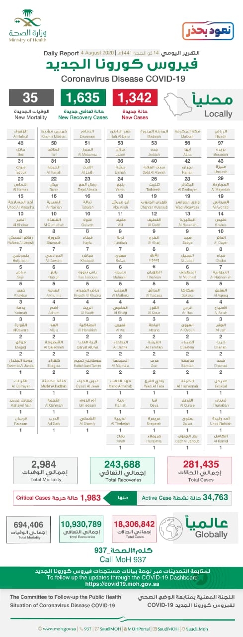 سجلت منها منطقة نجران 52 حالة توزعت على مدينة نجران ومحافظات يدمة وشرورة و بدر الجنوب وخباش…. الصحة تعلن تسجيل 1357 إصابة جديدة بفيروس كورونا