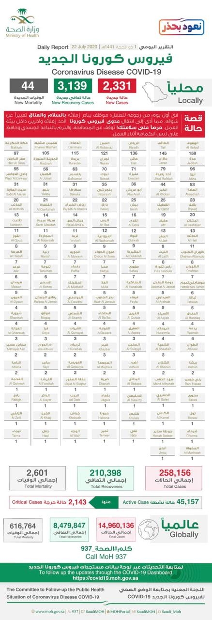 سجلت منها مدينة نجران 26 إصابة جديدة ومحافظة شرورة 26 إصابة وحبونا إصابة واحده.. وزارة الصحه تعلن تسجيل 2238 إصابة جديدة بفيروس #كورونا في المملكة