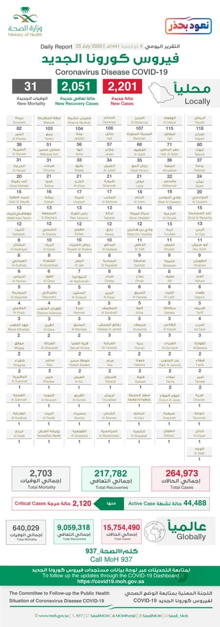 سجلت منطقة نجران منها 52 حاله جديدة.. “وزارة الصحة” تعلن تسجيل 1968 إصابة جديدة ب”#كورونا” .. في المملكة والإجمالي يرتفع إلى 266941.