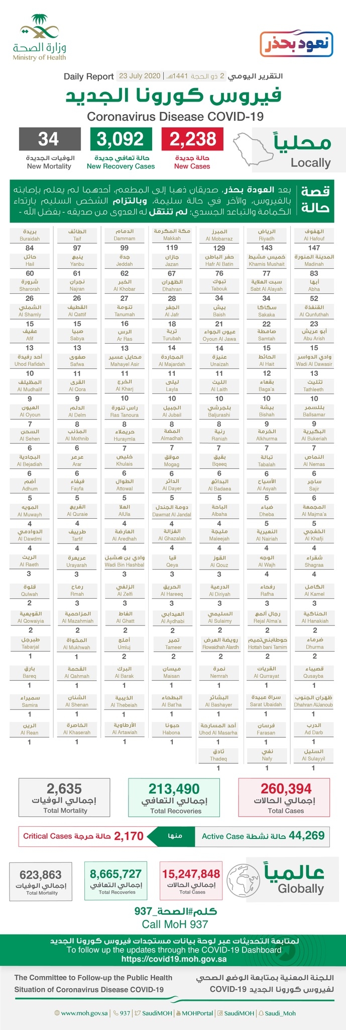 سجلت منها مدينة نجران 26 إصابة جديدة ومحافظة شرورة 26 إصابة وحبونا إصابة واحده.. وزارة الصحه تعلن تسجيل 2238 إصابة جديدة بفيروس #كورونا في المملكة