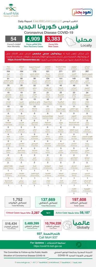 سجلت مدينة نجران 45 حاله ومحافظة شرورة 22 حاله وسجلت حبونا 5 ويدمه 4 وحاله واحده في محافظة خباش.. الصحه تعلن تسجيل 3383 إصابة جديدة بفيروس كورونا في المملكة
