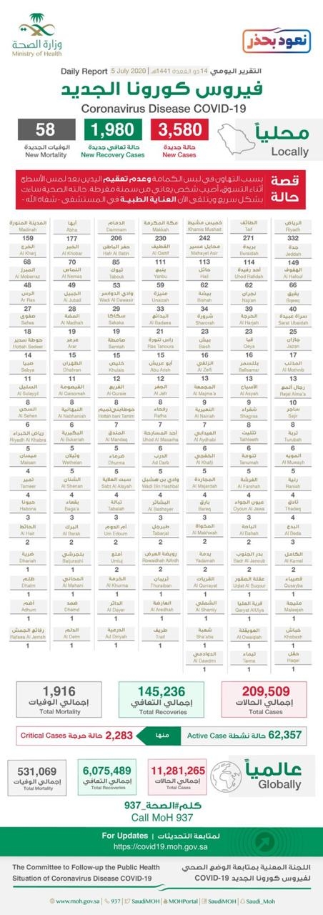منها 70 حالة في منطقة نجران.. «الصحة»: 3580 إصابة جديدة ب«#كورونا».. و1980 حالة تعافٍ إضافية.. و58 حالة وفاة