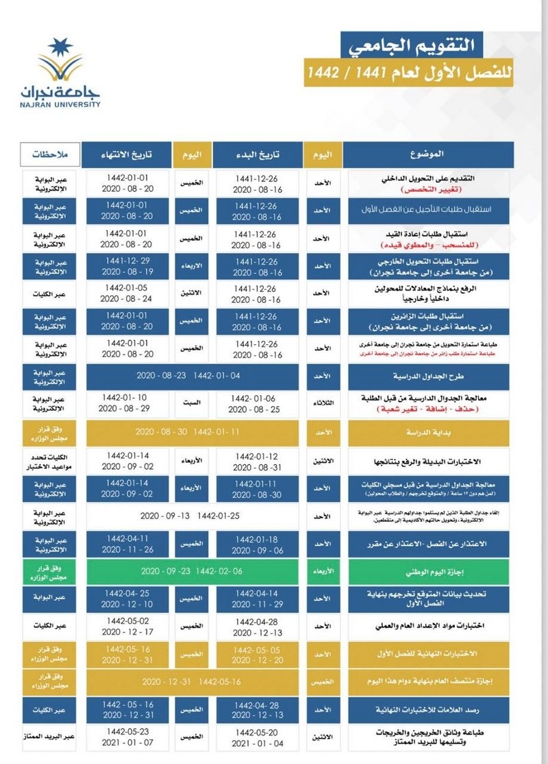 جامعة نجران تعلن التقويم الدراسي للفصل الأول من العام الجامعي 1441/ 1442هـ