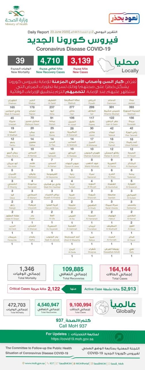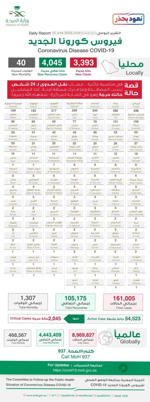 عاجل .. سجلت مدينة نجران منها 70 حاله و3 حالات سجلت في شرورة و5 حالات في محافظة يدمه وحاله واحده في بدر الجنوب.. الصحه تعلن تسجيل (3139) حالة إصابة جديدة بفيروس #كورونا
